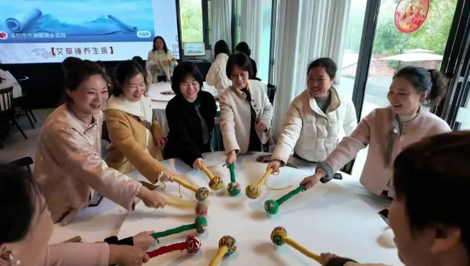 抵达休憩场地后,手工制作艾草捶活动温馨开启。工作人员讲解艾草温经通络、舒缓疲劳的养生功效,示范制作步骤。大家围坐一起,穿绳、填艾、捆扎、塑形,巧手翻飞间,一个个古朴雅致、散发清香的艾草捶就制作完成。指尖传递温情,艾草氤氲芬芳,既感受传统中医文化魅力,又收获实用养生好物,现场暖意融融。