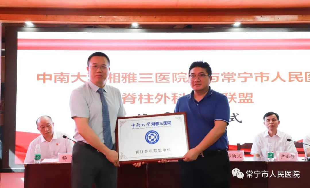 7月6日,中南大学湘雅三医院与常宁市人民医院脊柱外科专科联盟举行签约授牌仪式。
