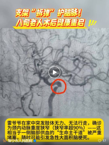 据悉,雷爷爷在家中突然出现肢体无力、无法行走的紧急情况,家人第一时间将其送医。我院通过精准检查,确诊其颈内动脉重度狭窄(狭窄率超90%)——这相当于一侧脑部供血的“生命主干道”被严重堵塞,随时可能引发急性大面积脑梗死。